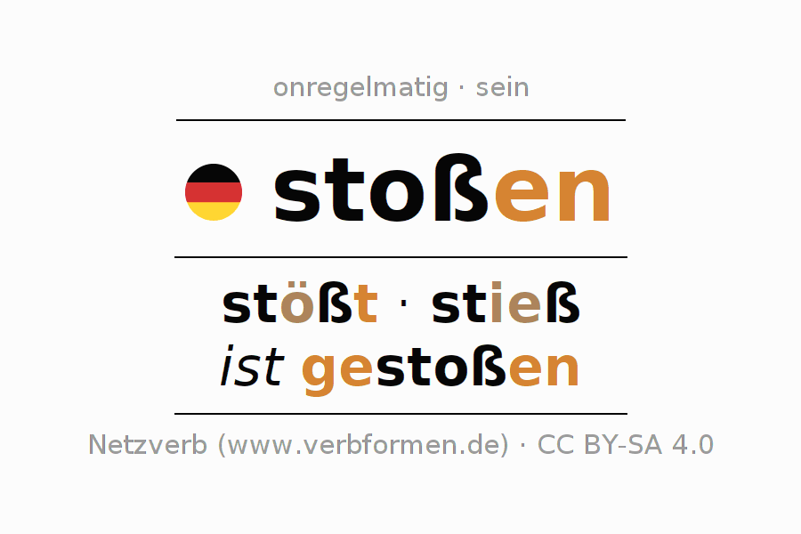 - Tegenwoordige tijd: ich stoße, du stoßest, er stoße, wir stoßen, ihr stoßet, sie stoßen