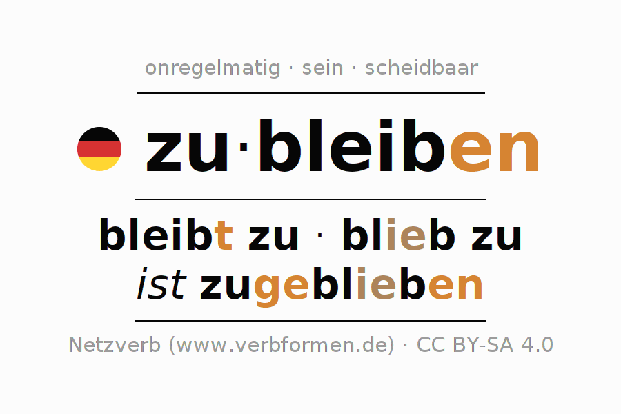 - Toekomende tijd I: ich werde zubleiben, du wirst zubleiben, er wird zubleiben, wir werden zubleiben, ihr werdet zubleiben, sie werden zubleiben
